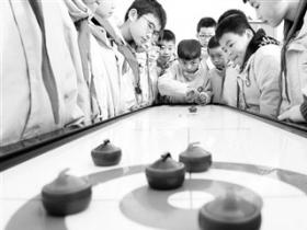 河北省滦州市第三实验小学的学生体验桌上冰壶。 新华社记者 杨世尧摄(资料照片)